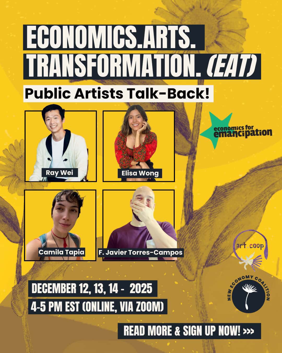 EAT: Economics. Arts. Transformation. Public Talk Back Series! Session 3: Communal Art & the Solidarity Economy Art.Coop, Economics for Emancipation, & the New Economy Coalition (Winter 2025) In this hour long session, artist and worker-owner, Camila Tapia-Guilliams, talks about their experience founding their art, design, and culture work collective called Transverse Cooperative, and doing training […]