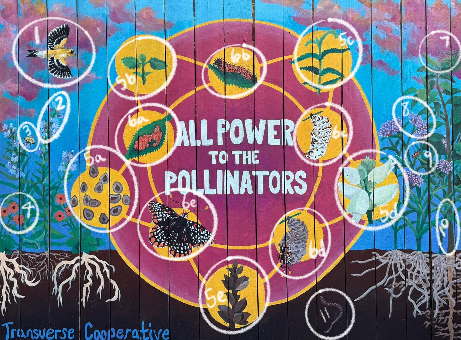 Upholding cooperative principle No.VI, “cooperation amongst cooperatives”, Transverse worked with Swamp Rose Co-op to make a mural in their native nursery space. The muralĀ celebrates pollinators and plant allies, depicting the intertwining life cycles of the Baltimore checkerspot butterfly (Euphydryas phaeton) and its native host plant, the white turtlehead (Chelona glabra), as well as several other native flora and fauna.